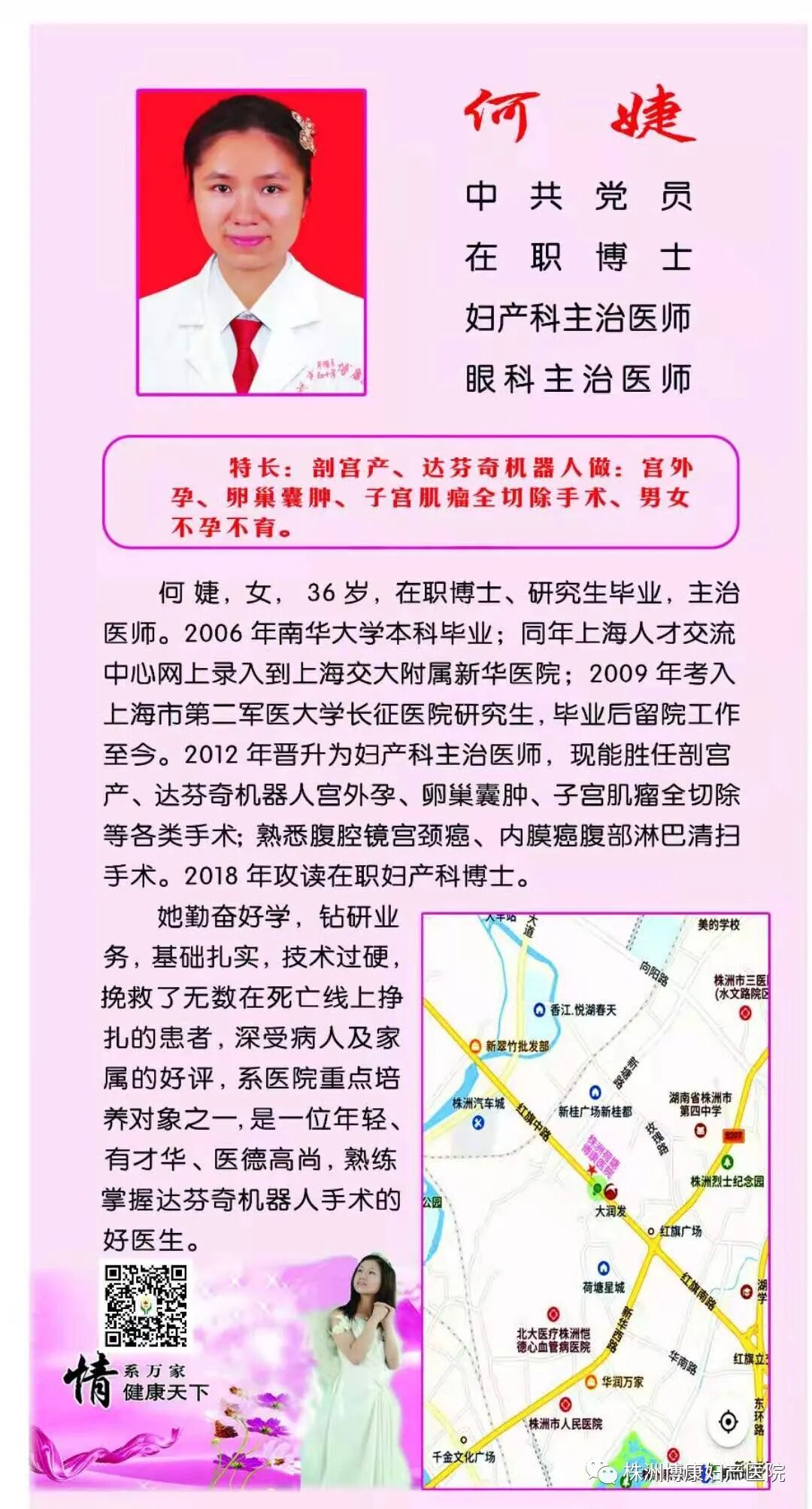 何婕,株洲博康妇产医院里面一位最年轻又有才华的妇产科医师,与何医师接触过的病患都非常喜欢她,不仅医术高超,而且为人友善,对待病患非常贴心、认真、负责。对学科深入钻研,不仅参与编著了《高龄女性生育指南》一书,自己还获得了导光阴道镜设计专利证书!